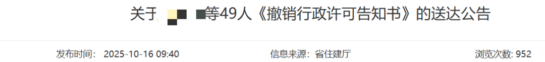 我厅依法作出《撤销行政许可告知书》并委托市级建设行政主管部门送达,因受送达人下落不明,市级行政主管部门采用邮寄送达、现场送达等形式均无法送达。根据《中华人民共和国民事诉讼法》第九十五条“受送达人下落不明,或者用本节规定的其他方式无法送达的,公告送达。自发出公告之日起,经过三十日,即视为送达”的规定,现依法公告送达。
